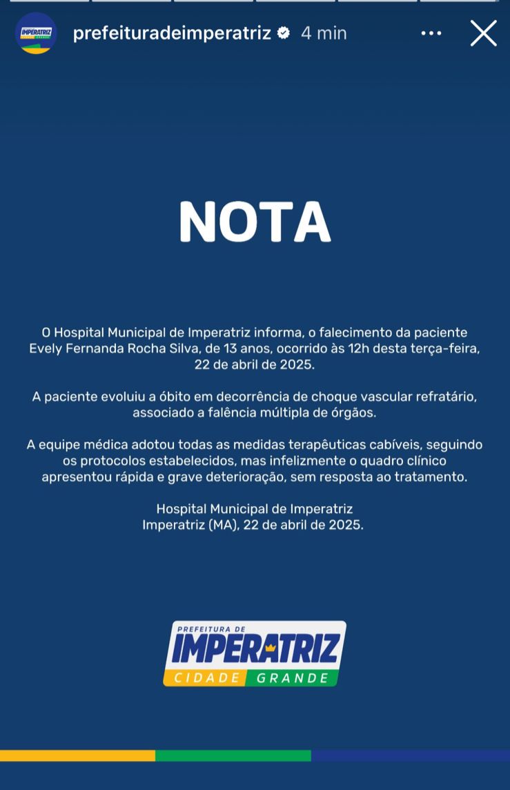 O HMI- Socorrão, divulgou nota nesta terça-feira, 22.04, informando o falecimento da jovem Evely Fernanda Rocha Silva que estava internada após consumir ovo de Páscoa envenenado.